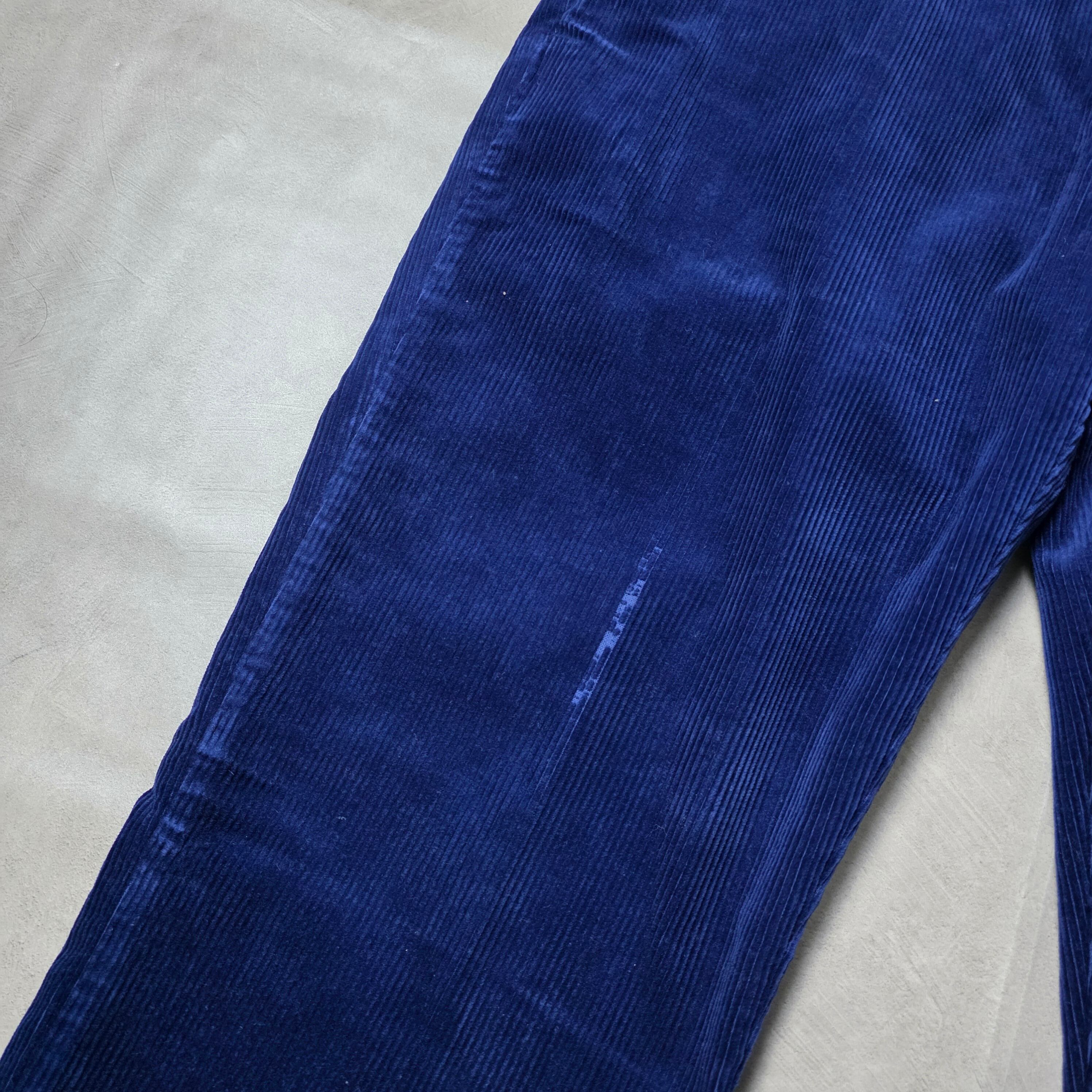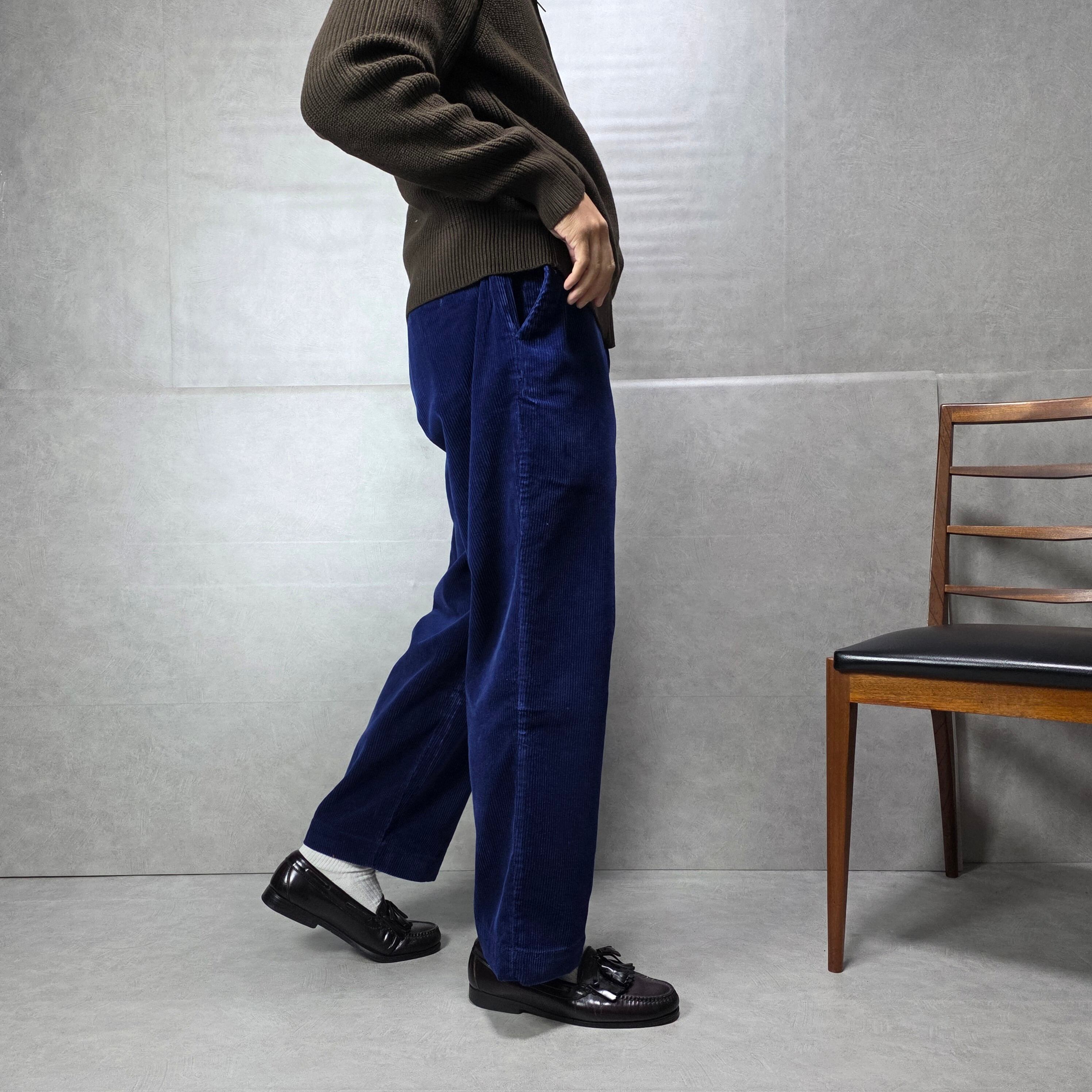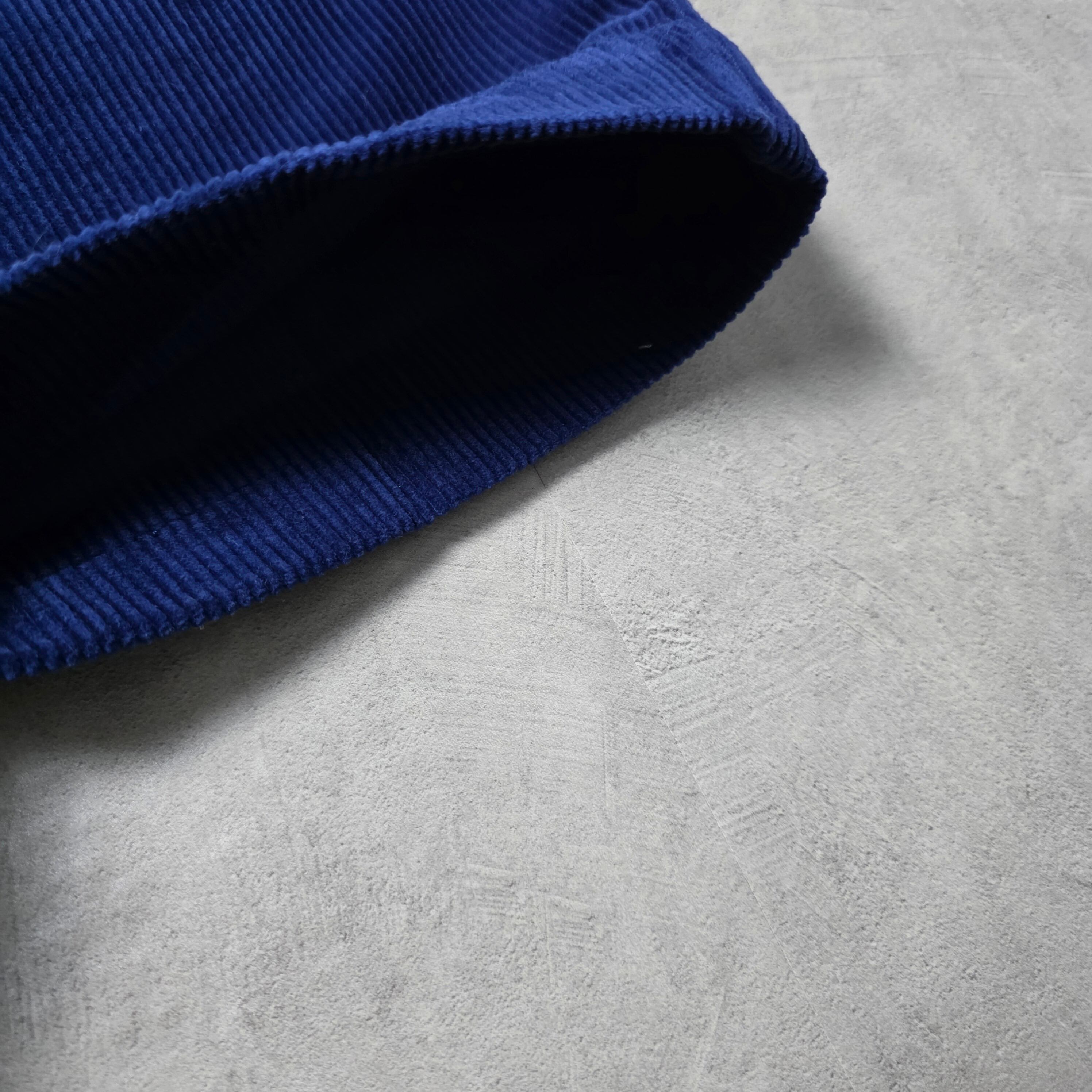 太畝のコーデュロイに鮮やかなブルーが映えるアイテム。