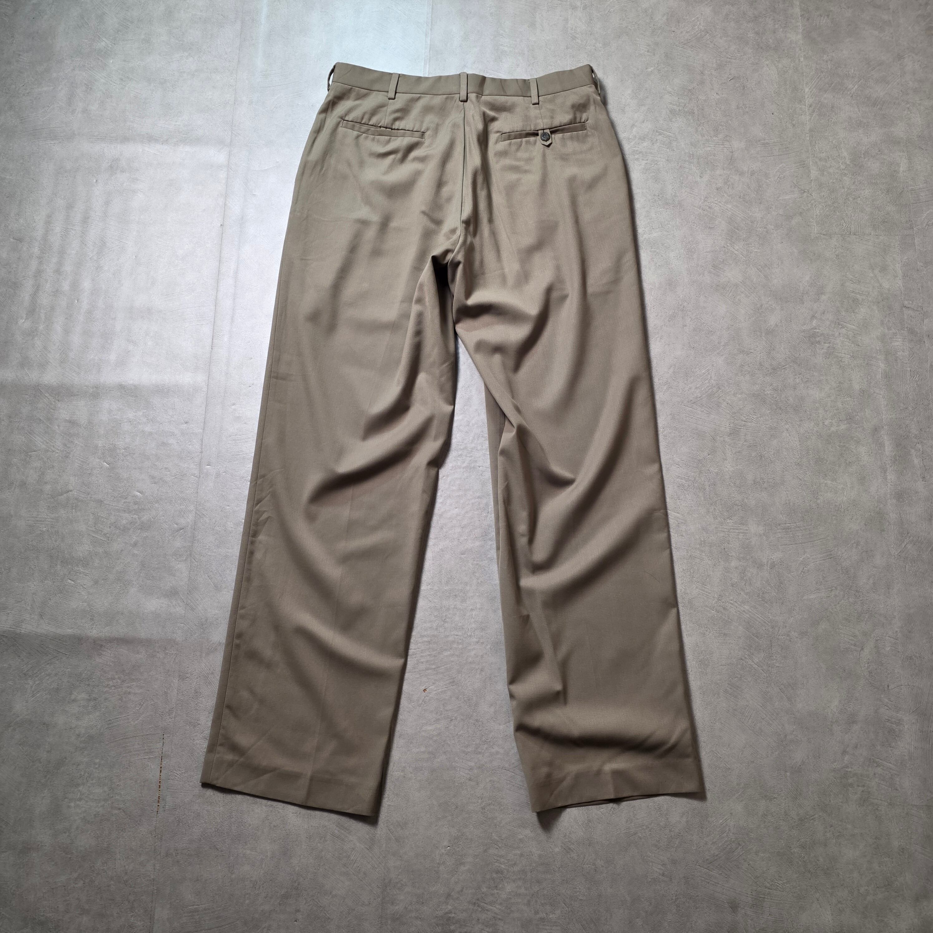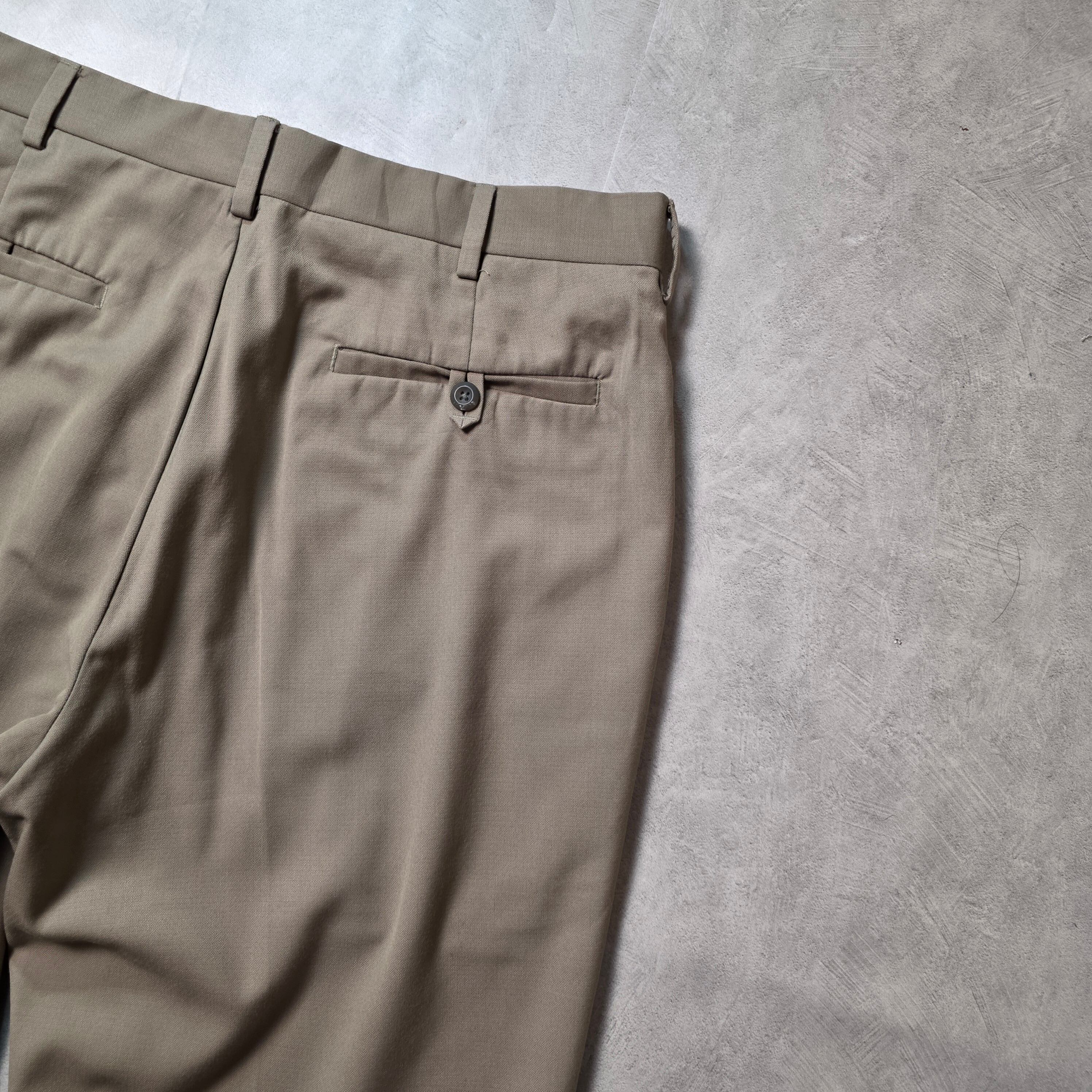 ベージュの柔らかい色味と、ポリレーヨンのトロっとしたような生地感が絶妙にマッチしているスラックス。