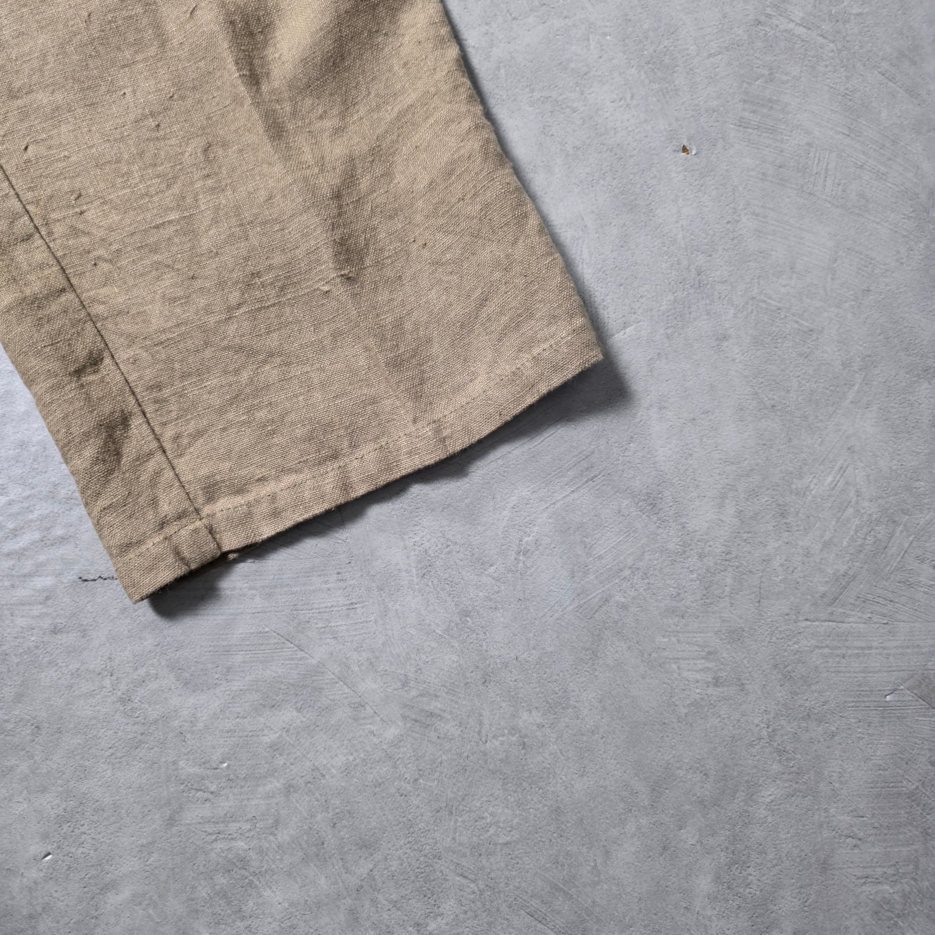 濃い生成のような優しい温かみのある色味と雰囲気、リネンの独特の質感、ネップも感じられる素晴らしい状態のリネンスラックス。