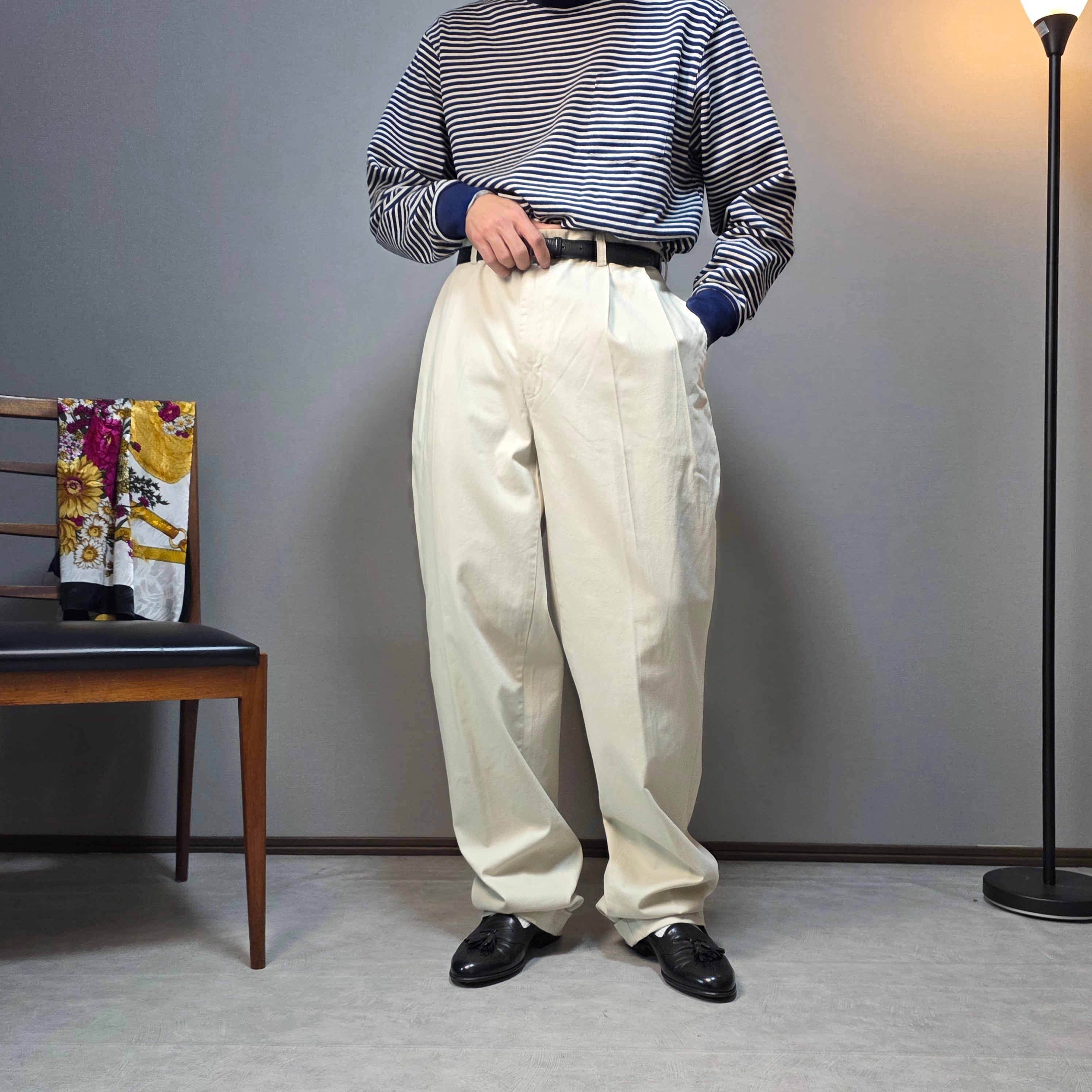 アイボリーの柔らかい色味も合わせやすく、万能なチノトラウザーズです